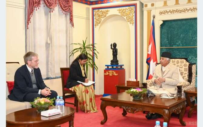 काठमाडौँ,  राष्ट्रपति रामचन्द्र पौडेलसँग नेपालका लागि संयुक्त राज्य अमेरिकाका राजदूत डीन आर थम्सनले आज राष्ट्रपति भवनमा बिदाइ भेट गर्नुभएको छ ।त्यस अवसरमा उहाँहरूबीच नेपाल–अमेरिका सम्बन्धका साथै आपसी हित र चासोका विषयमा छलफल भएको राष्ट्रपतिको