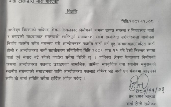 पुरा पढ्नुहोसताप्लेजुङको ‘नो केबलकार’ समूहलाई वार्तामा आउन गृह मन्त्रालयद्वारा पुन: आह्वान