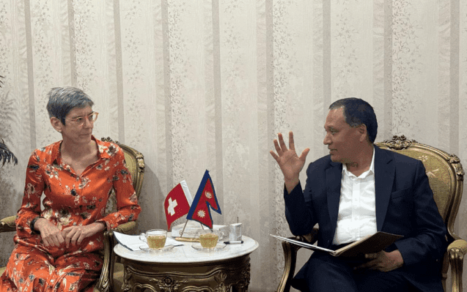 पुरा पढ्नुहोसकाठमाडौँ । ऊर्जा, जलस्रोत तथा सिँचाइमन्त्री कुलमान घिसिङ र नेपालका लागि स्वीट्जरल्याण्डका राजदूत डेनिएल मेउलीबीच शिष्टाचार भेटवार्ता भएको छ । सिंहदरबारस्थित ऊर्जा, जलस्रोत तथा सिँचाइ मन्त्रालयमा भएको भेटमा मन्त्री घिसिङलाई राजदूत मेउलीले स्वीट्जरल्याण्डकातर्फबाट