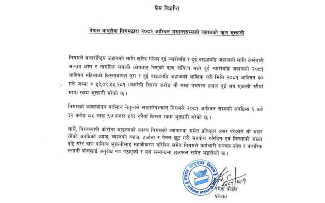 पुरा पढ्नुहोसनेपाल एयरलाइन्सले अहिलेसम्म तिर्यो ६ अर्ब ३२ करोड ऋण