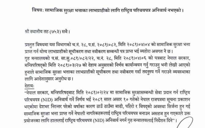 पुरा पढ्नुहोससामाजिक सुरक्षा भत्ताका लागि राष्ट्रिय परिचयपत्र अनिवार्य नगर्न सबै स्थानीय तहलाई पञ्जीकरणको सर्कुलर