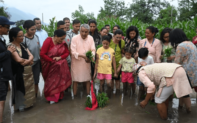 पुरा पढ्नुहोसकाठमाडौं । धान दिवसको उपलक्ष्यमा राष्ट्रपति भवन शीतल निवासमा रोपाइँ कार्यक्रम आयोजना गरिएको छ ।राष्ट्रपति कार्यालयद्वारा आयोजित रोपाइँ कार्यक्रममा राष्ट्रपति रामचन्द्र पौडेल, प्रथम महिला सविता पौडेललगायत सहभागी भएका छन् । रोपाइँ शुभारम्भ गर्दै राष्ट्रपति पौडेलले