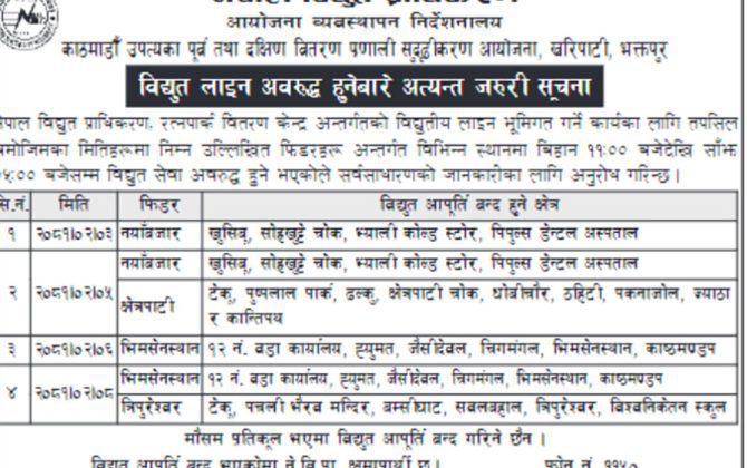 पुरा पढ्नुहोसकाठमाडौं । बिहीबारदेखि ४ दिन काठमाडौंका विभिन्न स्थानमा विद्युत् अवरुद्ध हुने भएको छ ।नेपाल विद्युत् प्राधिकरणको रत्नपार्क वितरण केन्द्र अन्तर्गतको विद्युतीय लाइन भूमिगत गर्ने भएकोले उपत्यकाको विभिन्न स्थानमा विद्युत् आपूर्ति अवरुद्ध हुने भएको हो