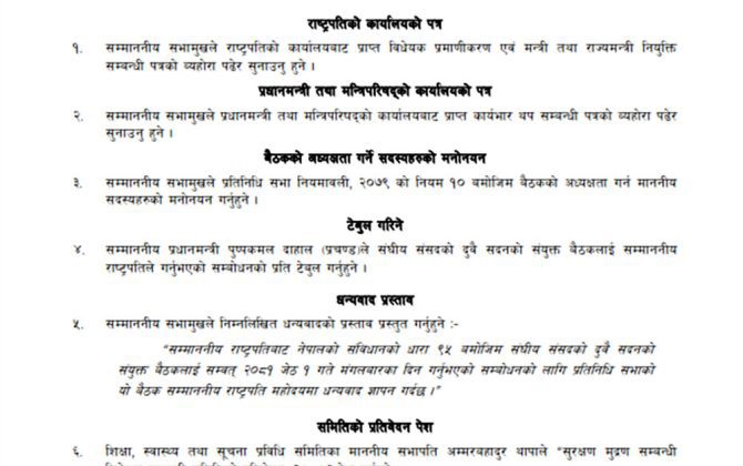 काठमाडौँ । बिहीबार बस्ने प्रतिनिधिसभाको बैठकका लागि सङ्घीय संसद् सचिवालयले सम्भावित ९ वटा कार्यसूची तय गरेको छ । बिहान ११ बजे बस्ने प्रतिनिधिसभा बैठकमा आइतबार पारित हुन नसकेको धन्यवादको प्रस्ताव पनि कार्यसूचीमा समावेश गरिएको