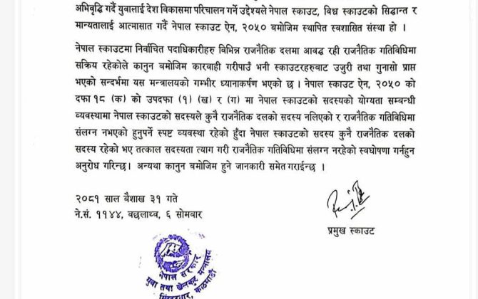 पुरा पढ्नुहोसकाठमाडौं । युवा तथा खेलकुद मन्त्रालयले नेपाल स्काउटको सदस्यलाई राजनैतिक दलको सदस्यता त्याग्न निर्देशन दिएको छ ।मन्त्रालयले स्काउटका सदस्य कुनै रजनीतिक दलको सदस्य रहेको भए तत्काल सदस्यता त्याग गरी राजनैतिक गतिविधिमा संलग्न नरहेको स्वघोषणा