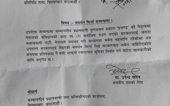 पुरा पढ्नुहोसकाठमाडौँ । जनता समाजवादी पार्टी नेपालले संसद सचिवालयलाई सरकारलाई दिएको समर्थन फिर्ता लिएको जानकारी गराएको छ ।जसपा नेपालका संसदीय दलका नेता उपेन्द्र यादवले सभामुखलाई एक पत्र लेख्दै प्रचण्ड नेतृत्वको सरकारलाई दिएको समर्थन फिर्ता लिएको