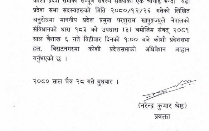 कोशीमा प्रदेशसभाको विशेष अधिवेशन आव्हान