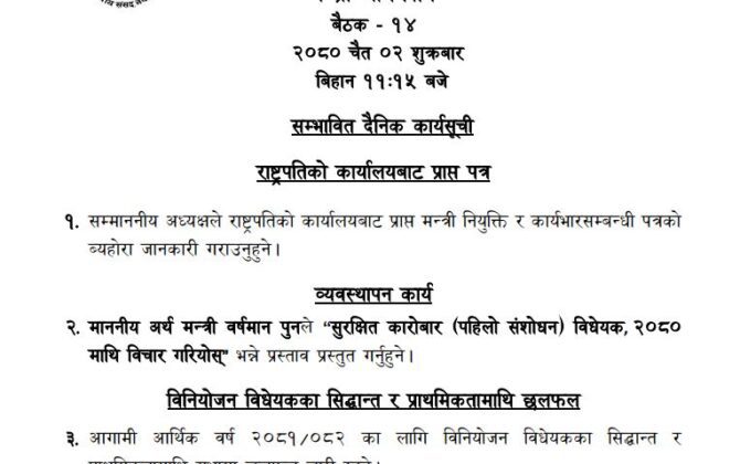 पुरा पढ्नुहोसकाठमाडौ । राष्ट्रियसभा बैठक बस्दैँछ । संघीय संसद भवन, नयाँ बानेश्वरमा उक्त बैठक बस्नेछ । बैठक बिहान ११ बजे बोलाइएको छ ।संघीय संसद सचिवालयका अनुसार आजको बैठकमा राष्ट्रियसभाका नवनिर्वाचित अध्यक्ष नारायणप्रसाद दाहालले राष्ट्रपति कार्यालयवाट प्राप्त