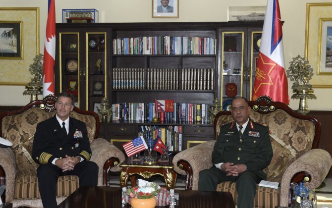 काठमाडौं। प्रधान सेनापति महारथी प्रभुराम शर्मा र अमेरिकाको इन्डो प्यासिफिक कमाण्डका कमाण्डर एडमिरल जोहन सी एक्यूलिनियोबीच जङ्गी अड्डामा शिष्टाचार भेटघाट भएको छ।प्रधान सेनापति शर्माको कार्यकक्षमा भएको भेटघाटमा वीरेन्द्र शान्ति कार्य तालिम केन्द्र, पाँचखालमा सञ्चालन
