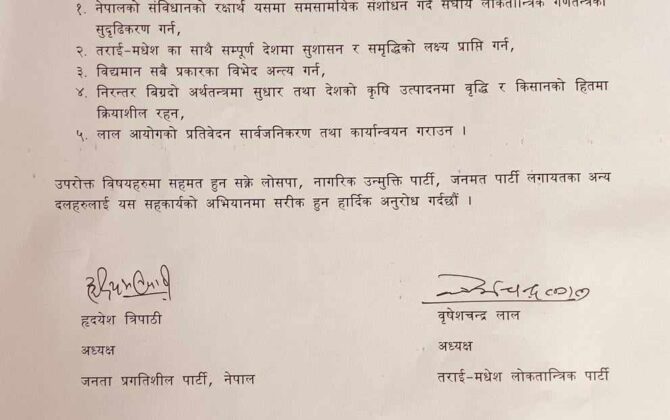 पुरा पढ्नुहोसकाठमाडौं । हृदयेश त्रिपाठीको नेतृत्त्वमा रहेको जनता प्रगतिशील पार्टी नेपाल र वृशेषचन्द्र लाल अध्यक्ष रहेको तराई–मधेस लोकतान्त्रिक पार्टीबीच सहकार्य गर्ने विषयमा ५ बुँदे सहमति भएको छ । बुधबार भएको सहमतिको पाँच बुँदामा ‘नेपालको संविधानको रक्षार्थ