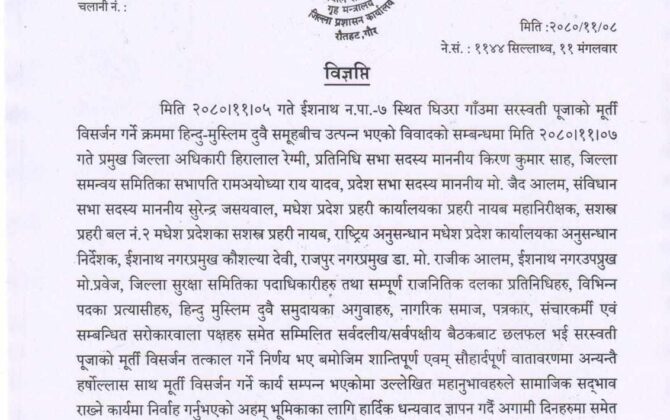 पुरा पढ्नुहोसरौतहट। जिल्ला प्रशासन कार्यालय रौतहटले सामाजिक सद्भाव कामय राख्न अपील गरेको छ । मंगलबार प्रमुख जिल्ला अधिकारी हिरालाल रेग्मीले विज्ञप्ति जारी गरेर सामाजिक सद्भाव कायम राख्न अपील गरेका हुन् । सर्वपक्षीय छलफलको निर्णयअनुसार ईशनाथ–७ स्थित