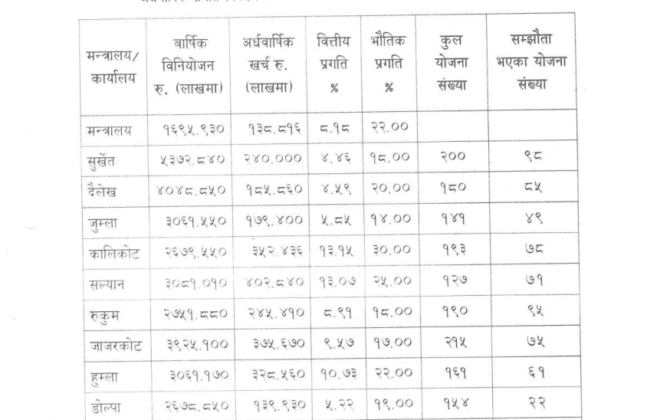 पुरा पढ्नुहोससुर्खेत । कर्णाली प्रदेशको जलस्रोत तथा उर्जा विकास मन्त्रालयले १ हजार ७१२ योजनामा हाल सम्मा ७३४ वटा योजनाको मात्र सम्झौता गरेको छ । प्रदेशका १० जिल्लाको विवरण हेर्दा सबै भन्दा कम्जोर जलस्रोत तथा उर्जा विकासमन्त्री