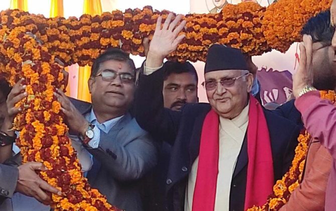 एमाले अध्यक्ष ओलीलाई रौतहटमा १०१ किलोको माला लगाएर स्वागत