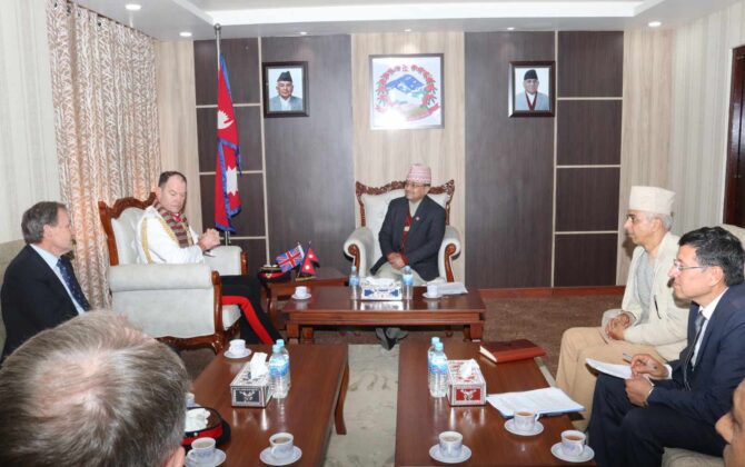 काठमाडौँ । उपप्रधानमन्त्री एवम् रक्षामन्त्री पूर्णबहादुर खड्कासँग बेलायती सेनाका सेनाध्यक्ष जनरल सर प्याट्रिक स्यान्डर्सले शिष्टाचार भेट गरेका छन् । मंगलबार सिंहदरबारस्थित रक्षामन्त्रालयमा भएको भेटमा उपप्रधानमन्त्री खड्काले सेनाध्यक्ष जनरल सर प्याट्रिक स्यान्डर्सलाई स्वागत गर्नुहुँदै यस