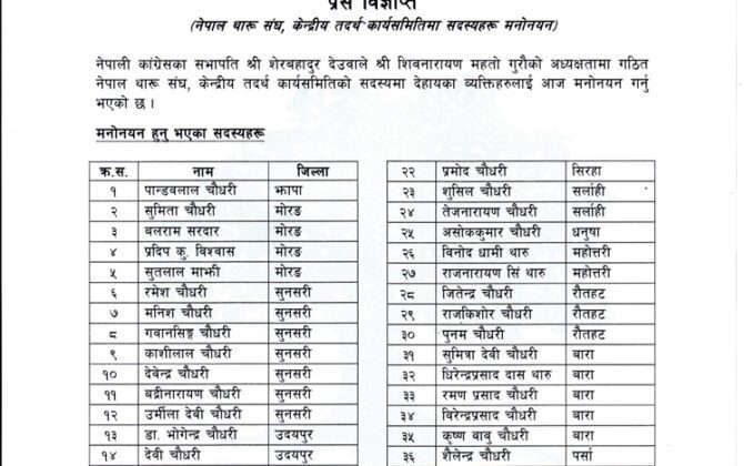 पुरा पढ्नुहोसकाठमाडौं। नेपाली कांग्रेसनिकट नेपाल थारू संघको केन्द्रीय तदर्थ कार्यसमितिमा ९८ जना सदस्य मनोनीत गरिएको छ । आइतबार कांग्रेस सभापति शेरबहादुर देउवाले शिवनारायण महतो गुरौको अध्यक्षतामा गठित नेपाल थारू संघको केन्द्रीय तदर्थ कार्यसमितिमा ९८ जना सदस्य