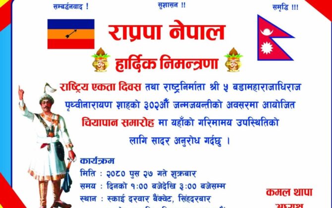 पुरा पढ्नुहोसकाठमाडौं । पृथ्वी जयन्तीको अवसरमा राप्रपा र राप्रपा नेपालले आज छुटाछुटै चियापान कार्यक्रमको आयोजना गरेका छन् । ३०२ औं पृथ्वी जयन्ती तथा राष्ट्रिय एकता दिवसको अवसरमा राप्रपा र राप्रपा नेपालले अलग अलग चियापान कार्यक्रमको आयोजना