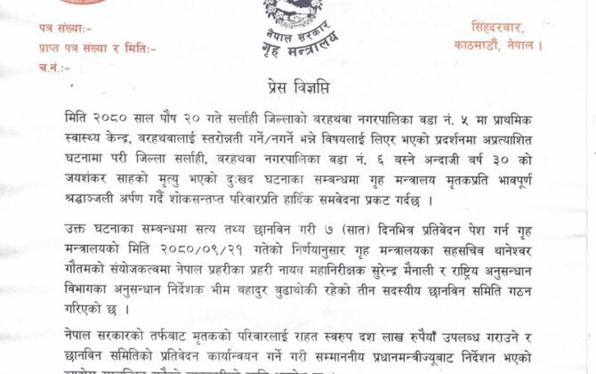 सरकारले सर्लाही घटनाका मृतकका परिवारलाई १० लाख रुपैयाँ राहत दिने