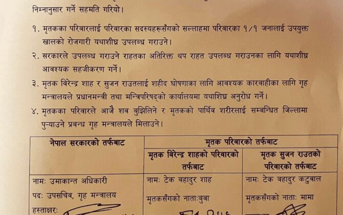 काठमाडौं। सरकार र बालकुमारी घटनामा ज्यान गुमाएका मृतक परिवारबीच चार बुँदे सहमति भएको छ। सोमबार गृह मन्त्रालयका प्रतिनिधि र मृतक परिवारबीच भएको छलफलमा चार बुँदे सहमति भएको हो।गत शुक्रबार ललितपुर महानगरपालिका-८ बालकुमारीस्थित इपिएस कोरिया