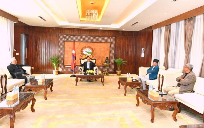 काठमाडौं । प्रमुख तीन दलका शिर्ष नेताहरूका बिचमा भेटबार्ता भएको छ।प्रधानमन्त्री पुष्पकमल दाहाल, नेकपा एमालेका अध्यक्ष केपी शर्मा ओली तथा नेपाली कांग्रेसका सभापति शेर बहादुर देउबाको बिचमा भेटबार्ता भएको हो ।साथमा सो बैठकमा कांग्रेसका