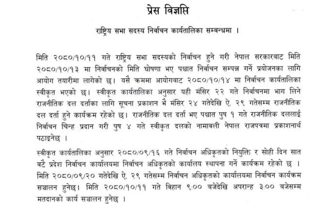 राष्ट्रियसभा निर्वाचन कार्यतालिकाः मंशिर २९ सम्म दल दर्ताकाे समयसिमा