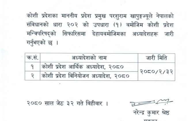 पुरा पढ्नुहोसकोशी प्रदेश प्रमुख खापुङद्वारा दुईवटा अध्यादेश जारी