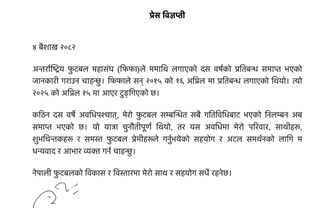 पुरा पढ्नुहोसगणेश थापा माथीको १० बर्षे प्रतिबन्ध फुकुवा, भन्छन्, ‘अब फेरी फुटबलको बिकासमा लाग्छु’