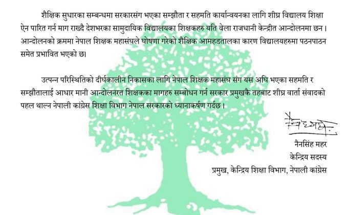 पुरा पढ्नुहोसशिक्षकका माग सम्बोधन गर्न सरकार प्रमुखबाटै वार्ता पहल होस्ः कांग्रेस