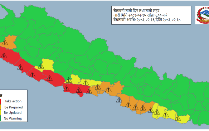 काठमाडौं।  आगामी तीन दिनसम्म देशभरको तापक्रम बढ्ने चेतावनी जल तथा मौसम विज्ञान विभाग मौसम पूर्वानुमान महाशाखाले दिएको छ।विगत केही दिनयता तराईका जिल्लामा तातो हावा चलिरहेको थियो। यो क्रम अब जेठ १८ गतेसम्म जारी रहने