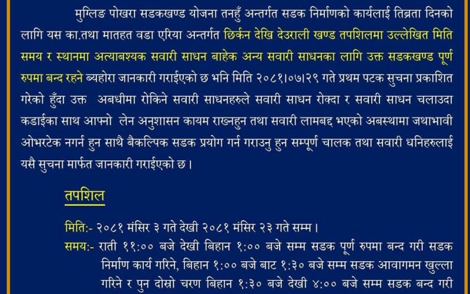 पुरा पढ्नुहोसमुग्लिङ-पोखरा सडकखण्ड दैनिक साढे ४ घण्टा बन्द हुने