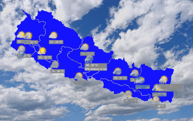 पुरा पढ्नुहोसकाठमाडौँ, हाल देशभर बङ्गालको खाडीबाट आएको जलवाष्प युक्त हावा (मनसुनी वायूको) प्रभाव रहेको छ । आज दिउँसो देशभर साधारणतया बदली रहने मौसम पूर्वानुमान महाशाखाले जनाएको छ । कोशी, मधेश, बागमती, गण्डकी र लुम्बिनी प्रदेशका