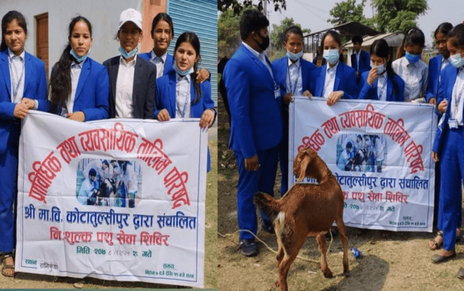 पुरा पढ्नुहोसबौनियाँ-कैलालीको बर्दगोरिया गाउँपालिका वडा नं ३ स्थित रामजानकी मन्दिरमा १ दिने निःशुल्क पशु स्वास्थ्य शिविर शुक्रवार सम्पन्न भएको छ । माध्यमीक बिद्यालय कोटातुल्सीपुरको आयोजनामा शिविर सम्पन्न भएको थियो । शिविरबाट ९५ जना सेवा ग्राही लाभान्वित