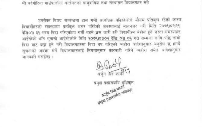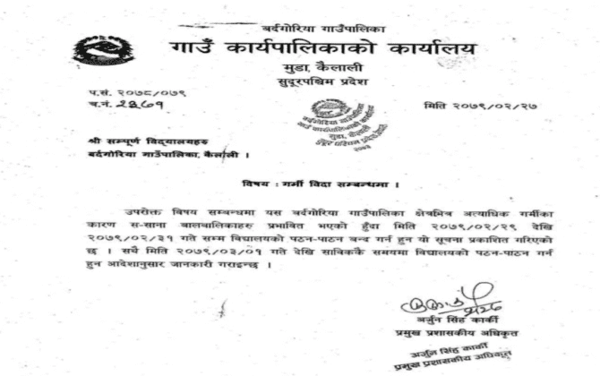 पुरा पढ्नुहोसबौनियाँ,कैलाली-पछिल्लो केही दिनयता ह्वात्तै गर्मी बढेपछि कैलालीको बर्दगोरिया गाउँपालिकाले सबै विद्यालयमा बिदा दिने निर्णय गरेको छ । शुक्रबार बर्दगोरिया गाउँपालिकाले एक सूचना जारी गर्दै ३ दिनका लागि गाउँपालिका भित्रका सम्पूर्ण विद्यालयमा बिदा दिने निर्णय