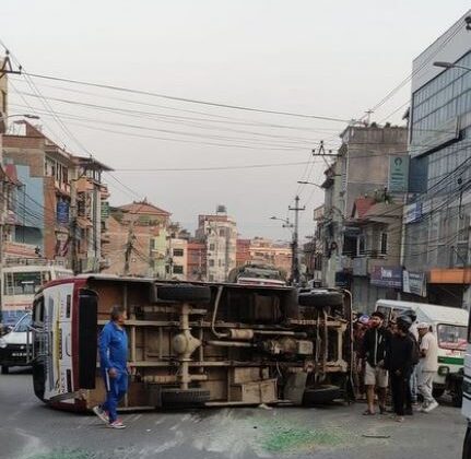 ललितपुरमा बिच सडकमा पल्टियो बस, १९ जना घाइते