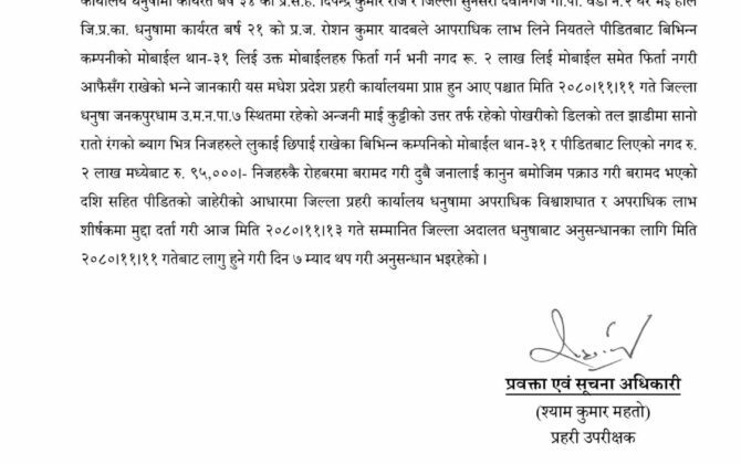 पुरा पढ्नुहोसरौतहट । मधेश प्रदेश प्रहरी कार्यालय प्रमुख डिआईजी यज्ञबिनोद पोखरेलको कडा निर्देशनपछि सर्वसाधारण व्यापारीको ३१ थान मोबाइलसँगै दुईलाख रुपैया ठग्ने बहालवाला एकजना प्रहरी सहायक हवल्दार र एकजना प्रहरी जवानलाई कानुनी कारवाहीको दायरामा ल्याइएको छ। डिआईजी