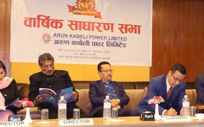 पुरा पढ्नुहोसकाठमाडौं । अरुण काबेली पावर लिमिटेडको तेर्हौं वार्षिक साधारणसभा सम्पन्न भएको छ । काठमाडौंको नयाँबानेश्वरस्थित इन्द्रेणी कम्प्लेक्सको मैत्री हलमा कम्पनीका अध्यक्ष रमेश प्रसाद न्यौपानेको अध्य्क्षतामा सम्पन्न भएको हो। साधारणसभाबाट आर्थिक वर्ष २०७९–८० को सञ्चालक समितिको