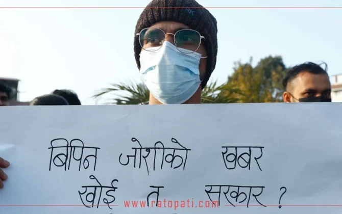 काठमाडौं । इजरायल–हमास युद्धका क्रममा बेपत्ता कञ्चनपुरका विपिन जोशीको सकुशल उद्धारको माग गर्दै राजधानीमा प्रदर्शन गरिएको छ। आइतबार बेपत्ता जोशीका आफन्त तथा साथीभाइहरूले सकुशल उद्धारको माग गर्दै प्रदर्शन गरेका हुन्। ललितपुरको लगनखेलबाट सुरु गरिएको र्याली जावलखेल