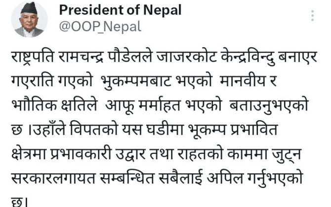 पुरा पढ्नुहोसकाठमाडौं, १८ कार्तिक । राष्ट्रपति रामचन्द्र पौडेलले जाजरकोट केन्द्रविन्दु भएर गए राति गएको भूकम्पबाट भएको मानवीय र भाौतिक क्षतिले आफू मर्माहत भएको बताएका छन ।राष्ट्रपति पौडेलले विपद्को यस घडीमा भूकम्प प्रभावित क्षेत्रमा प्रभावकारी उद्धार