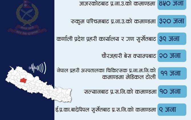 काठमाडौं, १८ कार्तिक । भुकम्प पीडितको उद्दारका लागि ८ सय ५९ जना परिचालन गरिएको छ । नेपाल प्रहरीका अनुसार जाजरकोटबाट प्रहरी नायव उपरिक्षकको नेतृत्वमा ४५० जना खटिएका छन् भने रूकुम पश्चिमवाट प्रहरी नायव उपरिक्षकको कमाण्डमा