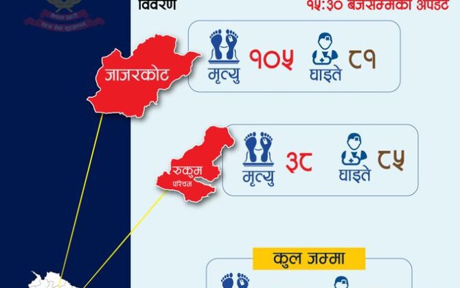 पुरा पढ्नुहोसकाठमाडौं, १८ कार्तिक । भुकम्पमा परी ज्यान गुमाउनेको संख्या १४३ पुगेको छ ।गए राती जाजरकोटलाइ केन्द्र बनाएर गएको भुकम्प परी हालसम्म १४३ जनाको ज्यान गएको हो भने घाइतेको संख्या १६६ जना पुगेका छन ।नेपाल
