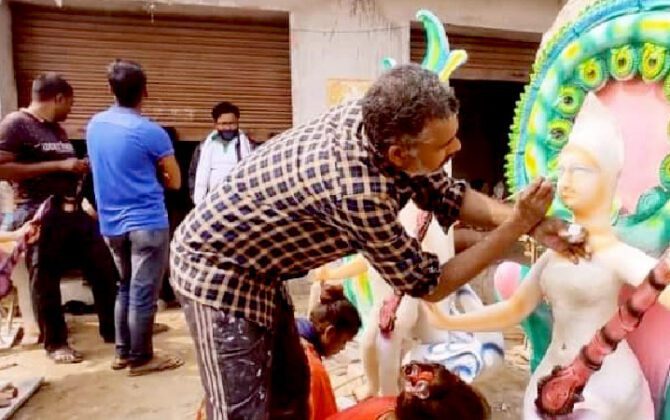 सरस्वतीको मूर्तिमा सीप निखार्दै कुम्हाल