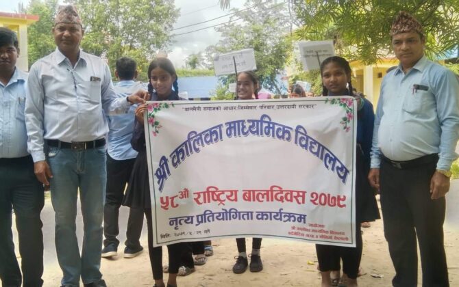 पुरा पढ्नुहोसबौनियाँ,कैलाली – जिल्लाकाे बर्दगाेरिया गाउँपालिका वडा नम्बर ४ मा रहेको कालिका माध्यमिक विद्यालयले ५८ औ राष्ट्रिय बाल दिवस विविध कार्यक्रमकाे आयोजना गरेर मनाएको छ ।कालिका माध्यमिक विद्यालयका विद्यालय व्यवस्थापन समिति अध्यक्ष टेक बहादुर कामिकाे