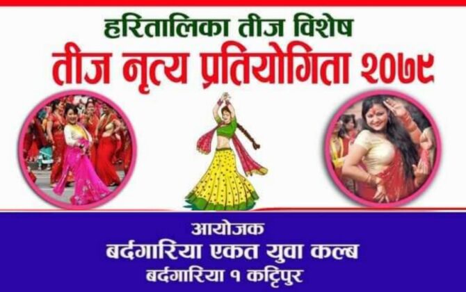 पुरा पढ्नुहोसहिन्दु नेपाली नारिहरुकाे माहान चाड हरितालिका तिजकाे अवसरमा तिज नृत्य प्रतियोगिता आयाेजना हुने भएको छ । कैलाली जिल्लाकाे बर्दगाेरिया गाउँपालिका वडा नम्बर १ मा रहेको बर्दगाेरिया एकता युवा क्लबको आयाेजनामा साे प्रतियोगिता हुन लागेको