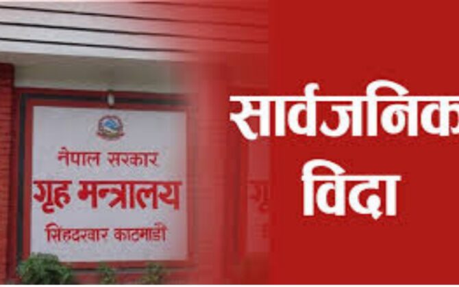 पुरा पढ्नुहोसकाठमाडौँ: सरकारले आगामी आइतबार सार्वजनिक बिदा दिएको छ। इस्लाम धर्मालम्बीहरुको पर्व बकर इदको उपलक्षमा सरकारले २६ गते अर्थात आइतबार बिदा दिएको हो। गृह मन्त्रालयले एक सूचना जारी गर्दै देशभर बकर इदका दिन सार्वजनिक बिदा दिएको