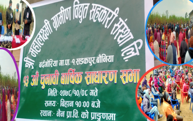 पुरा पढ्नुहोसबौनियाँ,कैलाली । बर्दगोरिया गाउँपालिका वडा न:- १ मा रहेको महालक्ष्मी ग्रामीण विद्युत सहकारी संस्था लिको १३ औ चुनावी वार्षिक साधारण सभा शनिवार सम्पन्न भएको छ । संस्थाका अध्यक्ष अमर बमको सभापतित्वमा भएको कार्यक्रममा बर्दगोरिया