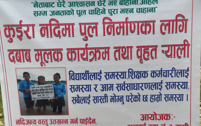 पुरा पढ्नुहोसबौनिया(कैलाली)।कैलालीको बर्दगोरिया गाउँपालिका वडा नं ३ मा पर्ने सेती लोक मार्ग सगै जोडिने कुईरा नदिमा पक्की पुल निर्माण,काँडा कुईरा नदीबाट नदी जन्य पदार्थ उत्खनन कार्य पुर्णरुपमा बन्द गर्नु पर्ने ,कटान नियन्त्रण तथा तटबन्ध गर्नका