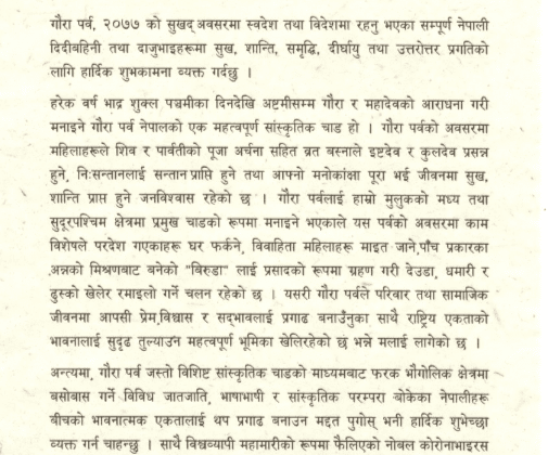 काठमाडौँ/राष्ट्रपति विद्यादेवी भण्डारीले विश्वव्यापी महामारीका रूपमा फैलिएको कोरोनाभाइरसको सङ्क्रमणबाट जोगिन सरकारले लागू गरेका स्वास्थ्यसम्बन्धी नियमको पालना गर्दै गौरा पर्व मनाउन आग्रह गर्नुभएको छ । राष्ट्रपति भण्डारीले गौरा पर्व २०७७ का अवसरमा स्वदेश तथा विदेशमा रहेका