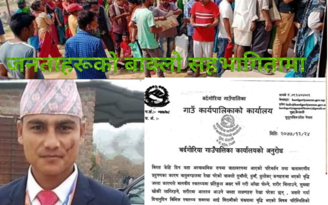 पुरा पढ्नुहोसबौनियाँ/कैलाली जिल्लाको बर्दगोरिया गाउँपालिकामा भूमिहीन दलित,भूमिहीन सुकुम्बासी र अव्यवस्थित बसोबासीको लागि लगत संकलनको प्रारम्भिक काम सुरु भएको १६ दिन पुगेको छ । भुमिहीनहरुको समस्या समाधानका लागि पालिकाले इकाई कार्यालय समेत संचालनमा ल्याई काम थालेको