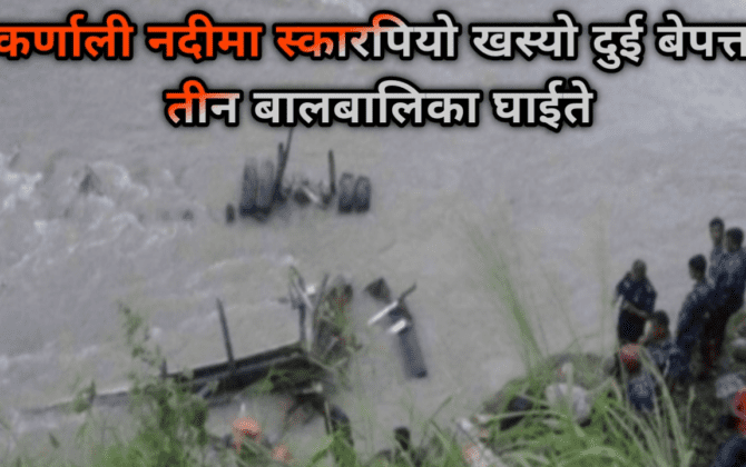 बौनियाँ/कैलालीको कर्णाली नदीमा स्कारपियो गाडी खस्दा दुई जना बेपत्ता भएका छन् । स्कारपियो दुर्घटनामा तीन जना बालक घाईते घएका छन् । कैलाली मोहन्याल गाउँपालिका वडा न.७ बाँका स्थित चिसापानी देखि सोल्टा जाने कच्ची सडक