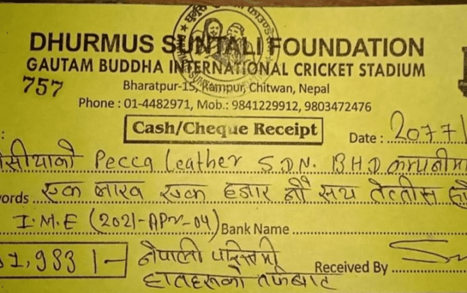 पुरा पढ्नुहोसबौनियाँ कैलाली/धुर्मुस सुन्तली फाउण्डेसनले चितवन जिल्लाको भरतपुर महानगरपालिका १५ मा निर्माण भईरहेको गौतम बुद्ध अन्तर्राष्ट्रिय क्रिकेट रंगशालाको काम अगाडि बढाउन धुर्मुस सुन्तली फाउण्डेसनलाई थप आर्थिक जुटाउन मलेसियाको क्वालालम्पुर स्थित पेक्का लेदर कम्पनीमा कार्यरत नेपाली