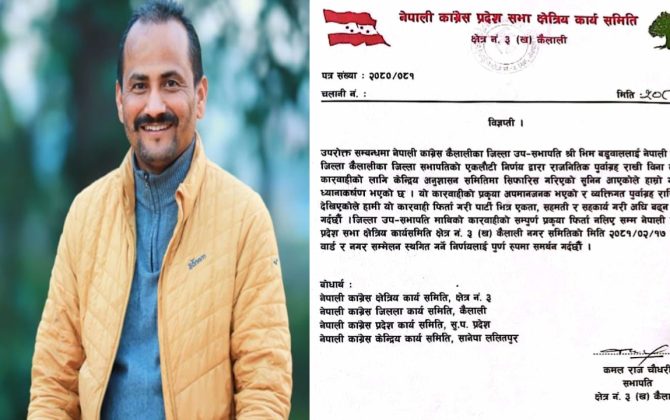 पुरा पढ्नुहोससुखड । नेपाली काँग्रेस कैलाली जिल्लाका उप–सभापति भीम बडूवालको कारबाही प्रक्रिया फिर्ता लिन नेपाली काँग्रेस प्रदेश सभा क्षेत्रीय कार्यसमिति क्षेत्र नं. ३ ‘ख’ कैलालीले माग गरेको छ । जिल्ला सभापति नारायण दत्त भट्टले एकलौटी